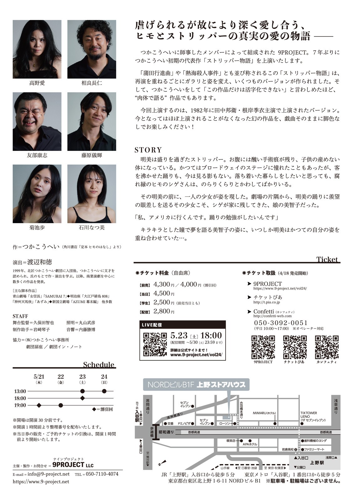 9PROJECT主催、『ストリッパー物語』が2026年5月21日 (木) 〜 2026年5月24日 (日)に上野ストアハウス(東京都台東区北上野1-6-11)にて上演されます。 チケットはカンフェティ(運営:ロングランプランニング株式会社、東京都新宿区、代表取締役:榑松 大剛)にて4月18日(土)10:00より発売されます。