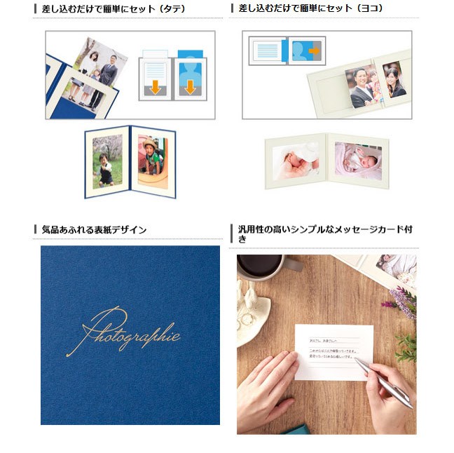 写真とメッセージカードを差し込むだけで簡単にセットできる差し込みタイプ。のりやテープなどは一切不要で入れ替えもカンタンです。2面とも写真をセットすることも可能。贈るシーンや伝えたい想いに合わせて、自由に組み合わせることができます。