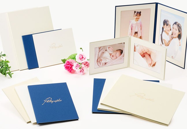 表紙にはフランス語で「写真」を意味する「Photographie」を筆記体で、控えめにかつ印象深くあしらいました。洗練された美しさと気品を纏い、贈る相手に上質感を伝えるエレガントなデザインに仕上げました。