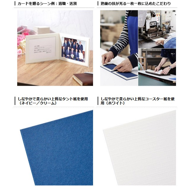 国内工場で熟練の職人が一枚ずつ丁寧に仕上げた上質なフォトメッセージカード。機械には出せない繊細な風合いと、手づくりならではの温もりが、贈る方の真心を伝える特別な一枚となり、贈り物の価値をさらに引き立てます。