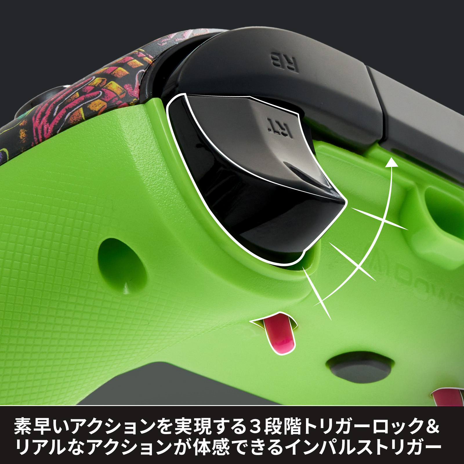 暗闇で光る蓄光とブラック/UVライトの下でネオンカラーに発光する2種類の発光を特徴としており、バーチャルアイテムコード、ムーンバウンス(エモート)が付属。プレイ中でも即座に割り当て変更が可能な2つのアドバンスドゲーミングボタンと、トリガーの押し込み具合を調整できる3段階トリガーロックを搭載。さらに、二重振動機能、高精度のアナログスティック、滑らかな操作を実現する摩擦防止リング、そして軽量で快適な人間工学に基づいたデザインなど、優れた操作性を支える機能を多数搭載。付属のUSB-Cケーブル(3m)で、離れた場所からでも快適にプレイ可能。有線接続により入力遅延を最小限に抑え、バッテリーの充電も不要です。Windows 10/11にも対応。