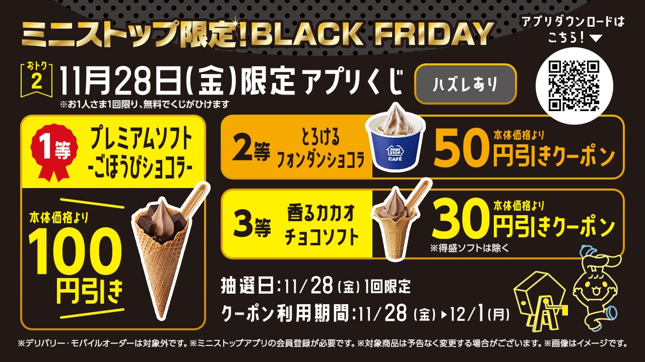 ミニストップは、2025年11月18日(火)より、「ブラックフライデー」を開催します。今年は、ブラックフライデーにちなんだ新商品を10種類発売!ミニストップアプリでは、「北海道ミルクソフト」「クランキーチキン各種」「カウンターコーヒー各種」の値引きクーポンを配信します。ブラックフライデー本番の11月28日(金)は、人気のアプリくじを実施します。