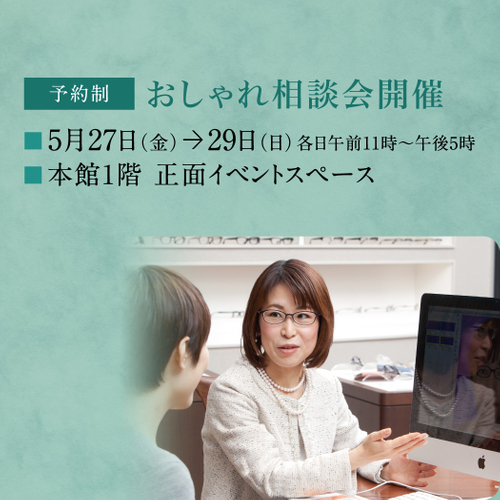 初夏のファッションをより楽しく引き立てる、個性あふれるアイウェアをこの機会にぜひご試着ください。27日(金)~29日(日)はカラーコーディネーターによるトータルファッションアドバイスも承ります。