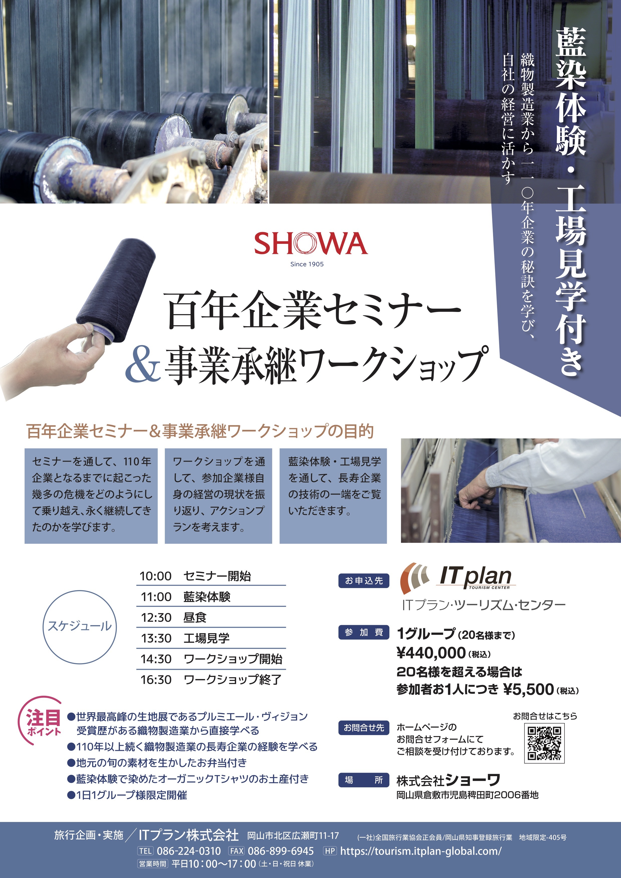 ITプラン株式会社(本社:岡山県岡山市、代表取締役:太田 記生)は、織物製造業の株式会社ショーワ(本社:岡山県倉敷市、代表取締役社長:片山 真一朗)と共同企画した「百年企業セミナー&事業承継ワークショップ」の販売を開始いたしました。