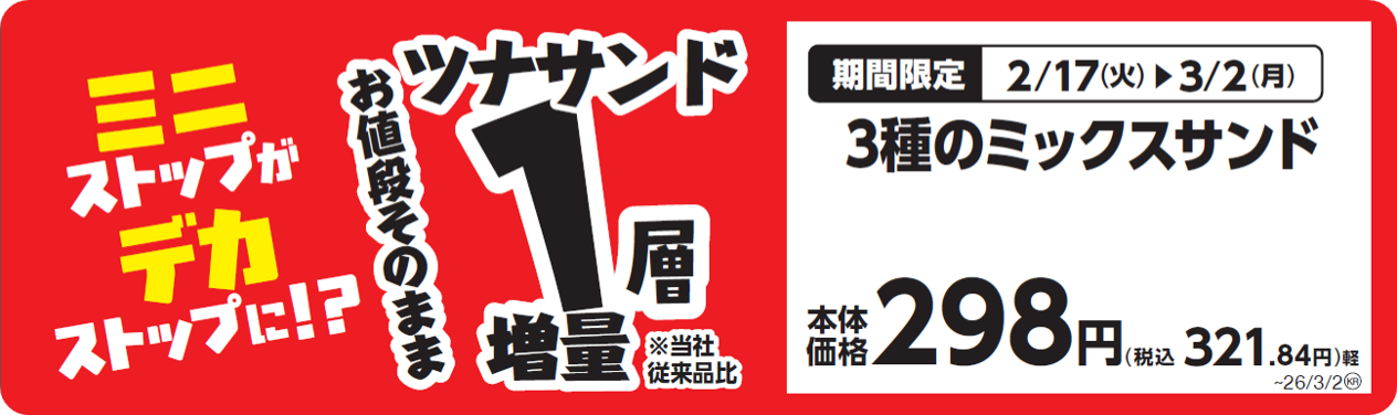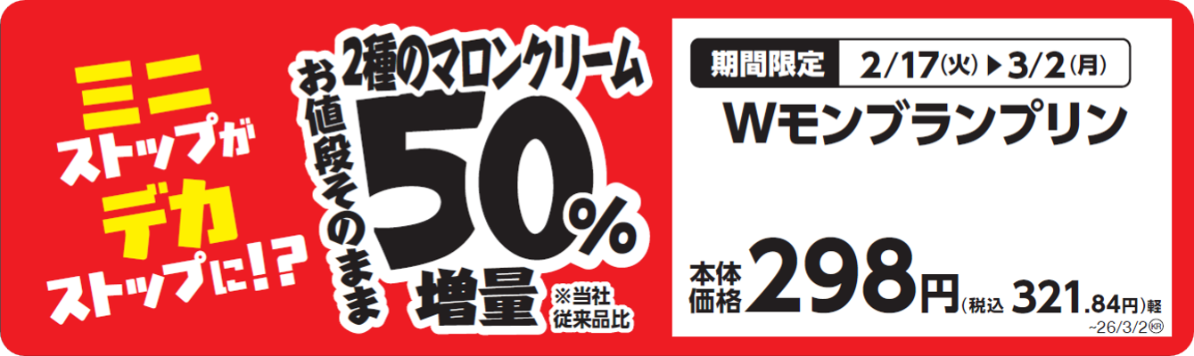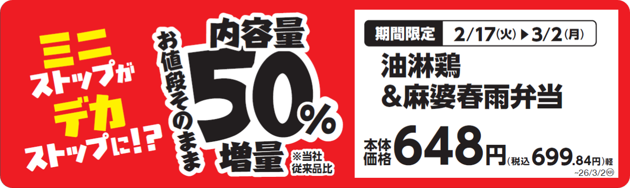 ミニストップは、2026年2月17日(火)より人気商品を通常より50%増量した「増量フェア」を、国内のミニストップで開催します。