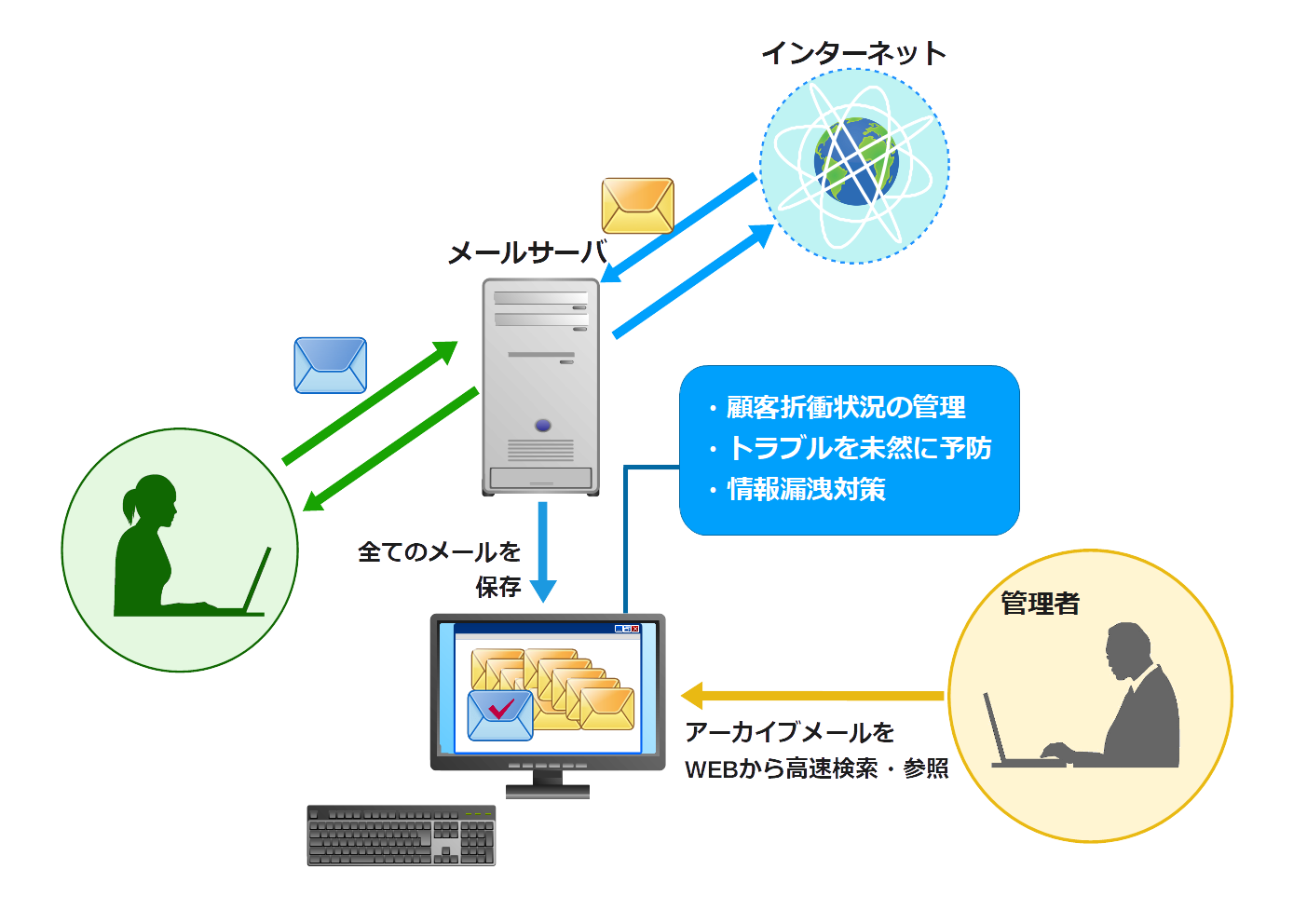 「メールアーカイブ」は、顧客とのメールを保管し、問題発生時の原因調査やコンプライアンスの対応などを目的に、一定期間内に生成されたメールのすべてを保管することを指します。過去のメールを適切に保管することで、トラブルが発生した場合に経緯を明確にできることもあります。必要な時に特定のメールをすぐに検索でき、参照できるメールアーカイブシステムは、不要なトラブルを回避するためにも必要です。