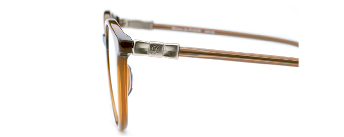 フロントがプラスチック、つるがメタルのコンビネーションフレーム。目元のアンティーク調のモチーフが、上品さをプラスしてくれます。つるの長モダンには、リボンとローズのモノグラム柄をプリントしています。