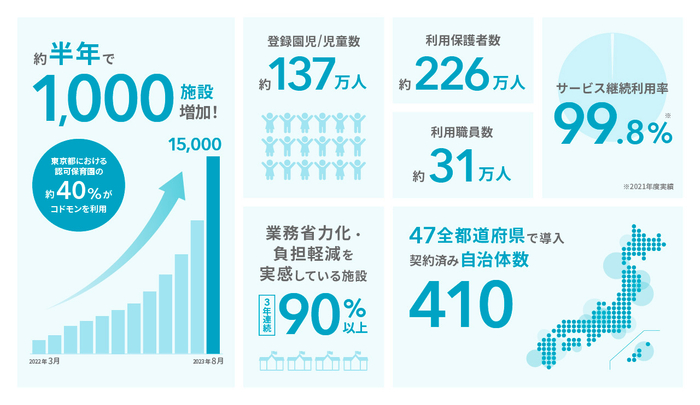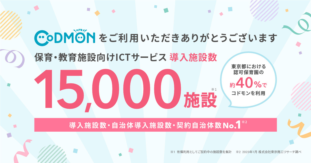 株式会社コドモン(本社:東京都港区、代表取締役:小池義則)は、当社が展開する保育・教育施設向けICTサービス「CoDMON」(以下:コドモン)の有償利用での導入施設数が、2023年8月22日(火曜日)に15,000施設※1を超えたことをお知らせいたします。2023年2月28日の14,000施設から約半年で新たに1,000以上の施設に新規導入されました。東京都における認可保育園の41.05%※2で導入されており、公立施設※3においては全国410自治体での導入が決定いたしました。
