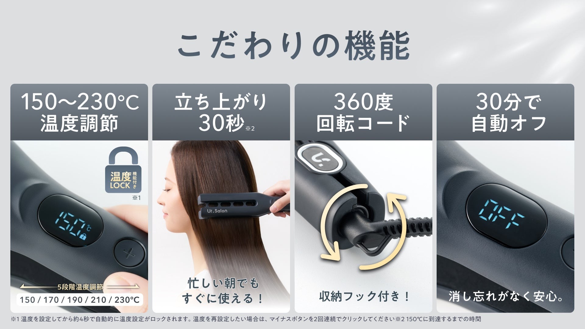 ストレートアイロンを使っても、時間が経つと広がる、湿気でうねりが戻る、熱ダメージが心配といったお声が多く寄せられていました。Ur.Salonでは「毎日使うからこそ、髪にやさしく、簡単で、仕上がりが続くこと」を追求。熱と冷却を繰り返す独自構造や髪を均一に挟む設計を採用し、自宅でもプロ級の艶ストレートが叶うヘアアイロンを開発しました。