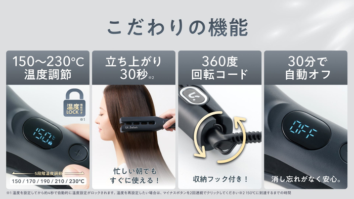 150〜230℃の5段階温度調節と見やすいLED表示を搭載し、髪質や仕上がりに合わせた最適なスタイリングが可能。30分自動オフや温度ロック機能も備え、忙しい朝や家族での共用でも安心して使えます。海外対応電圧で旅行先でもいつもの艶ストレートをキープ。毎日の使用でも操作に迷わず、ヘアアイロン初心者から上級者まで快適に使える設計です。長く愛用できます。
