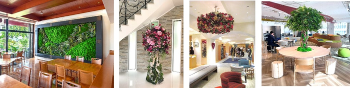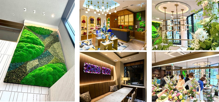 左:店内壁面の苔のプリザーブドフラワー 中上:ベル・フルール銀座本店 店内 中下:VIPルーム 左上下:ベル・フルール銀座校