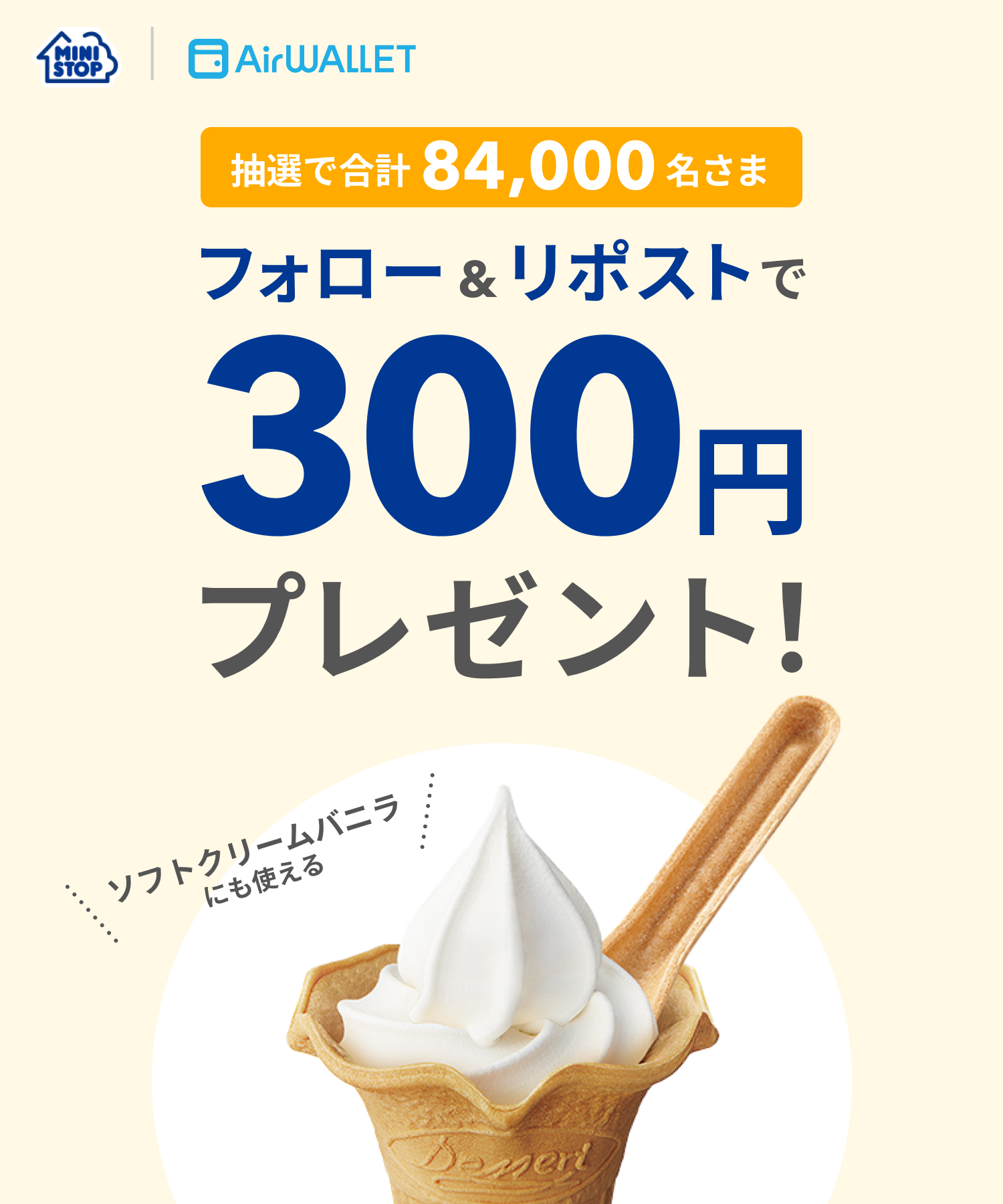 第2弾の応募期間中、エアウォレットアプリをダウンロードし、エアウォレット公式Xアカウント(@AirWALLET_jp)をフォローし、キャンペーン対象投稿をリポストしてキャンペーンサイトからX認証をした方に抽選で、以下のとおりミニストップソフトクリームバニラの決済にもご利用いただける300円のCOIN+残高をプレゼントします。