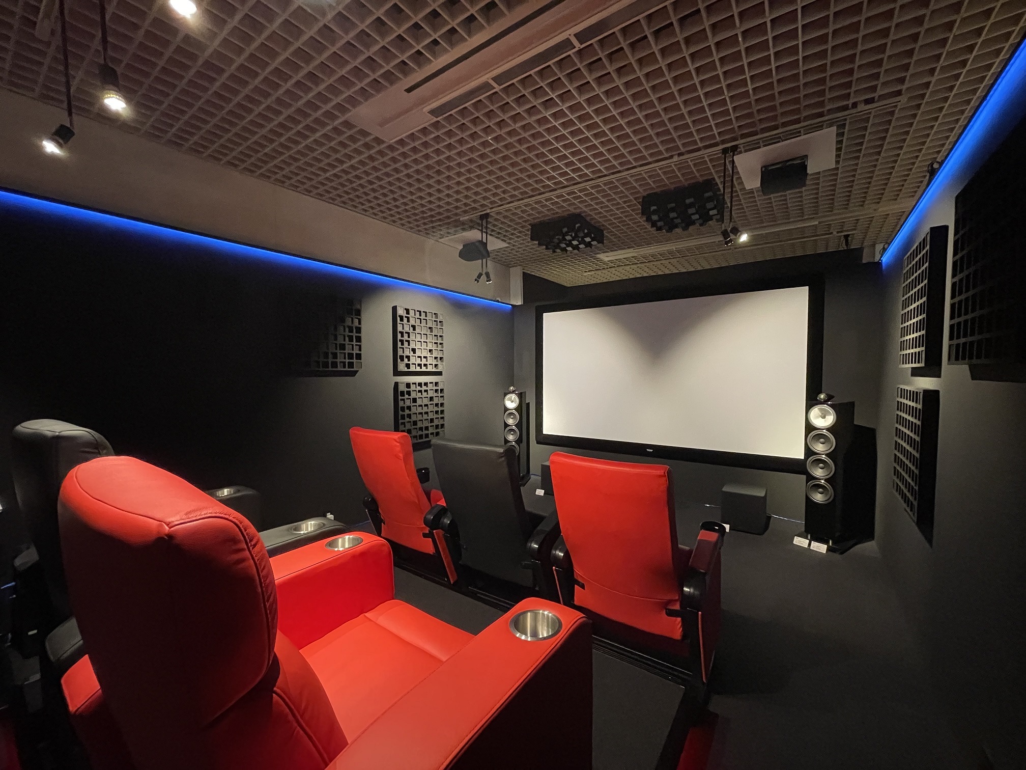 店内にはホームシアターの没入感(イマーシブ)を最も味わえる「専用室シアター」ルームを完備。雰囲気を高める内装の専用暗室には、Victorの最新8Kプロジェクターを常設し、120インチの大画面で視聴できる他、DENONの最新AVアンプによるサラウンド試聴環境を完備。最新イマーシブオーディオ(Dolby Atmos/DTS:X)に対応させるため、13本ものスピーカーと2台のウーファーを常設しています。英国B&W社の高級スピーカーをメインに据え、壁面や天井にも複数のスピーカーを配置することで、視聴位置を取り囲む最新の立体サラウンドを体験する事ができます。