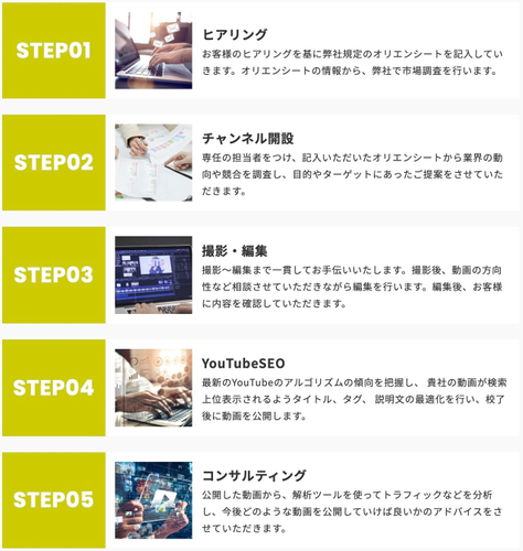 そこで培った実績とともに「売上に直結する問題解決」と「根本問題を解決する分析力」を強みとしてYouTubeマーケティング事業を行っております。チャンネルの企画力・制作力・分析力を基盤とし、企画から制作、編集、運用までワンストップで支援を行っています。