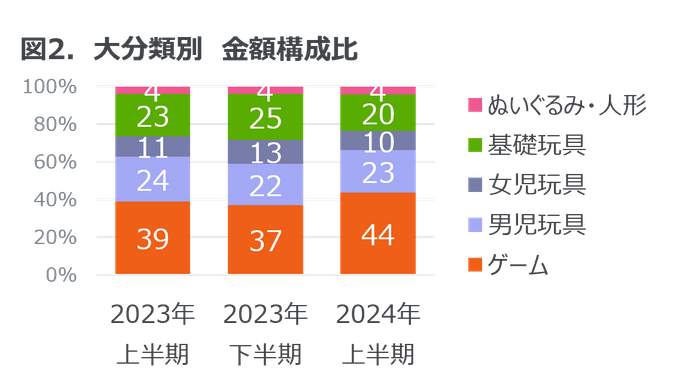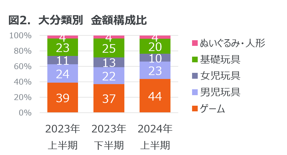 大分類別にみると、5つの大分類すべてがプラス成長を遂げる中、特に「ゲーム」の金額が30%増と、2020年上半期以降9半期連続の二桁成長が続き好調であった。なかでもトレーディングカードゲームは、 「ワンピース」や「ポケットモンスター」を筆頭に、 「仮面ライダー ガッチャード」「ドラゴンボール」「遊戯王」など多くのキャラクターが販売金額を伸ばし、「ゲーム」の金額伸長に貢献した。その結果、2024年上半期の玩具販売に占める「ゲーム」の金額構成比は前年同期から5%ポイント増加し、44%に達した(図2)。
