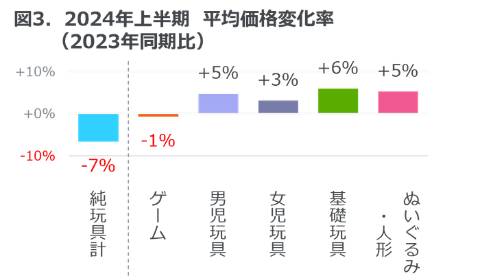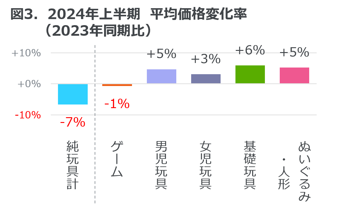 ・平均価格が低い大分類「ゲーム」の構成比拡大により、玩具全体の平均価格は前年よりも7%低下したものの、ゲーム以外の平均価格は上昇傾向を継続した。