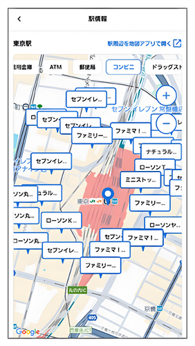 ATMやコンビニ等、駅周辺の施設情報を確認できます。