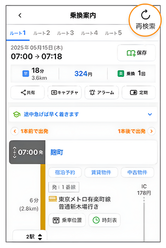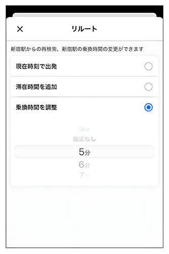 途中駅での乗換時間を1分単位で調整可能になりました。利用者の実態に近い検索が可能になります。