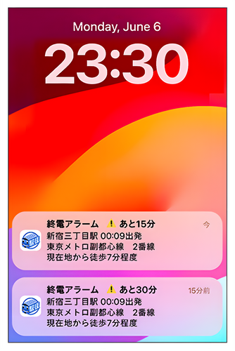 事前に設定した終電時刻に合わせてプッシュ通知でお知らせする機能。乗り遅れの等のリスクを回避するための機能です