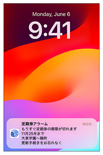 定期券の有効期限が近づくと自動でプッシュ通知する機能。