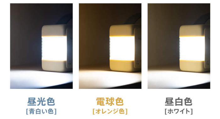 昼光色、電球色、昼白色の3つのパターンの明かりを備えています。さらに、3段階の明るさ調節も可能。避難時は昼光色を強く、避難所では電球色を弱くなど、状況に応じて変更することが出来ます。