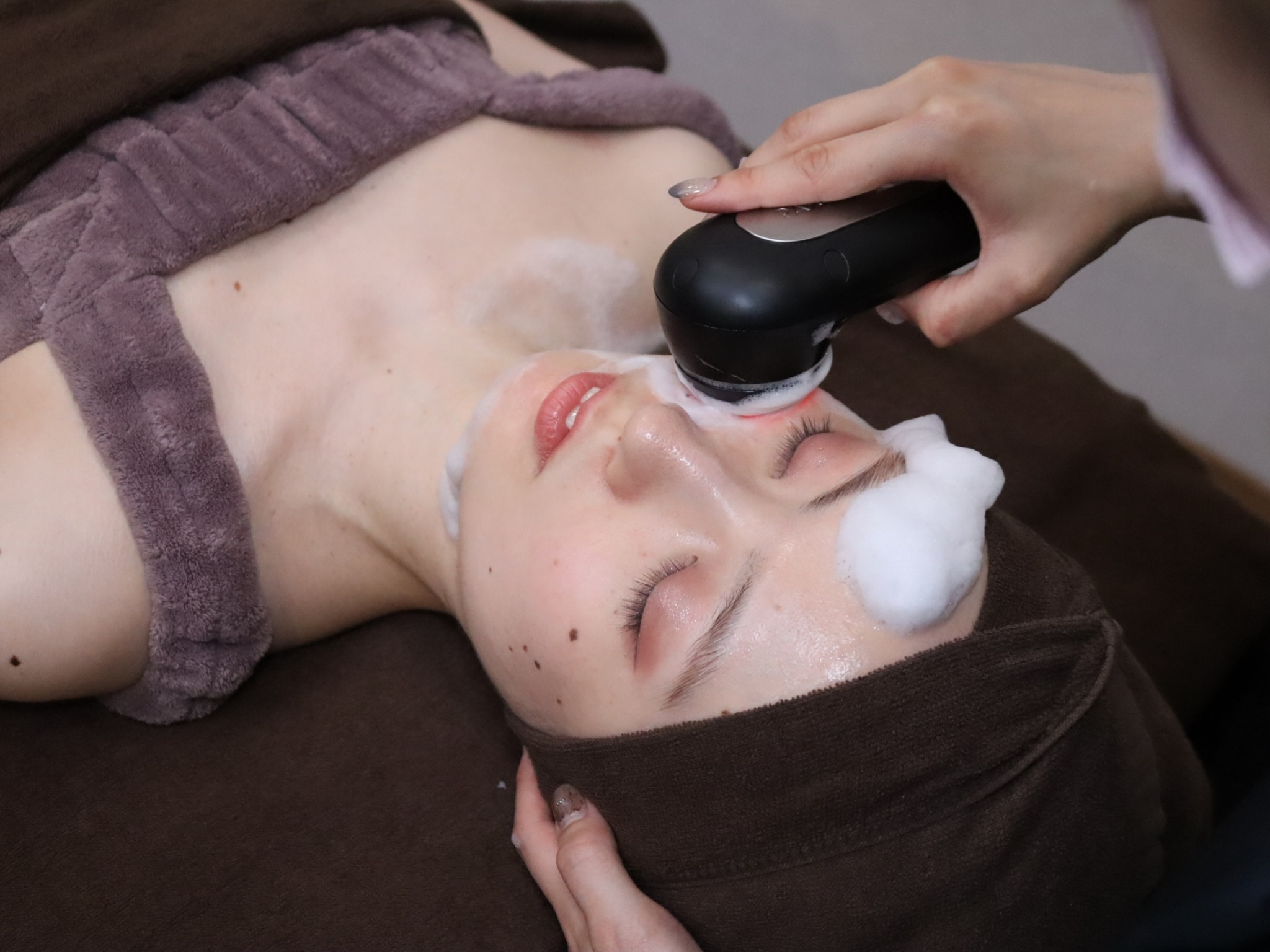 「高濃度コラーゲン泡」×「特殊電流美顔器」×「筋膜リリース」を組み合わせた技術で、表面的なケアに留まらず顔の土台から根本改善にアプローチします。