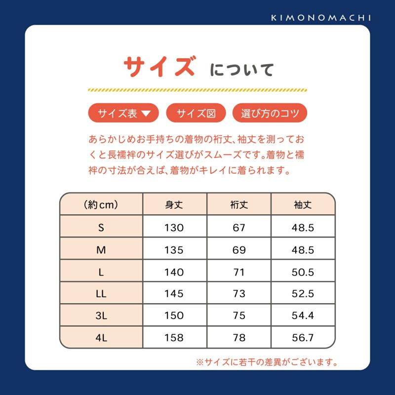 さらに、女性用長襦袢はSから4Lまでサイズを豊富に取り揃えております。サイズ選びは、身丈や裄、ヒップサイズに合わせることがポイントです。