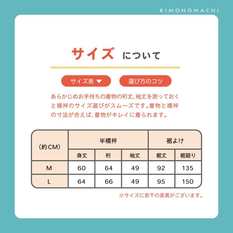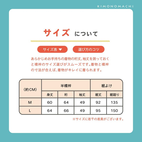 M 半襦袢:身丈60、裄64、袖丈49 / 裾よけ:裾丈92、裾まわり135
