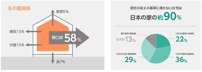 2050年カーボンニュートラルの達成に向けて、住宅を含む家庭部門のCO2削減目標は66%(2013年度比)と他の部門に比べて最も高い数値が設定(環境省)され、住宅の高性能化による省エネルギー化は重要な施策の一つと位置付けられています。住まいの中でも、特に窓や玄関ドアなど開口部からの熱の流出は冬の暖房時は約6割と大きく、開口部を高性能化することで、CO2削減に大きく貢献できます。しかしながら、現在の省エネ基準に満たない住宅は、日本の家の約90%にも及び、既存住宅の高性能化の推進が喫緊の課題です。