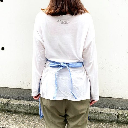 紐を結ぶタイプのエプロンなので、サッと脱ぎたい時にも便利。着用時も楽ですし、後ろ姿もスッキリとして見えますね♪