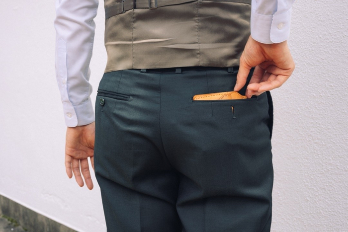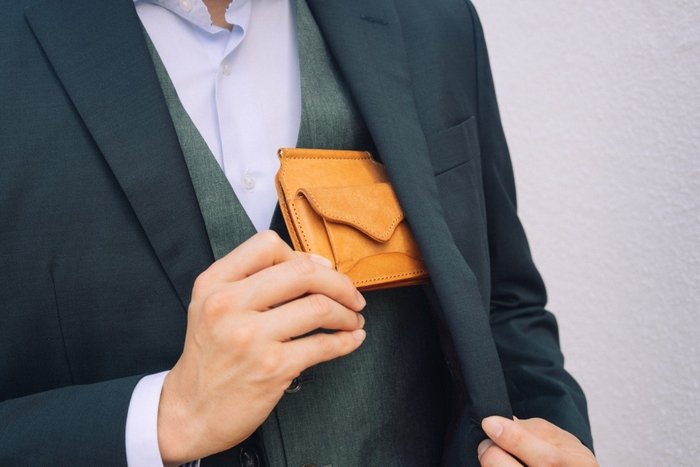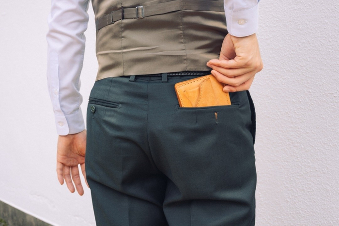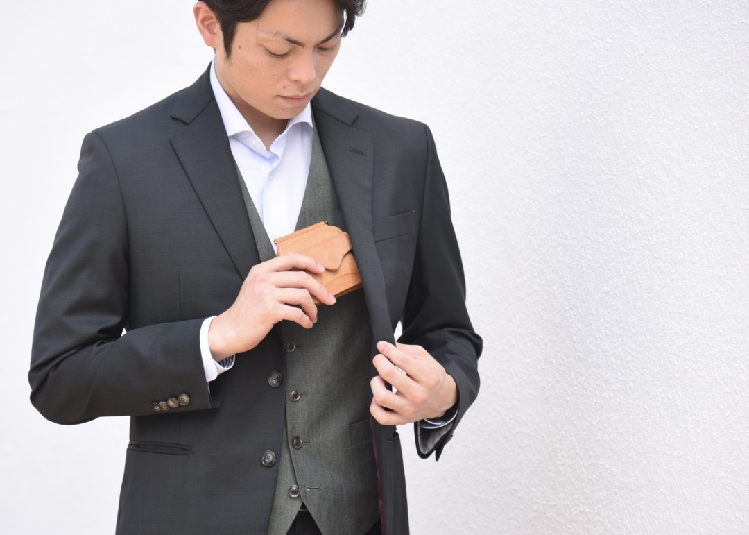 ジャケットの胸ポケットはもちろん、ズボンの後ろポケットに入れてもぽっこりしないサイズ感。さらに薄く・軽く使いたい場合は小銭入れを外すか収納量を調整しながらシーンに合わせて幅広くお使い下さい。