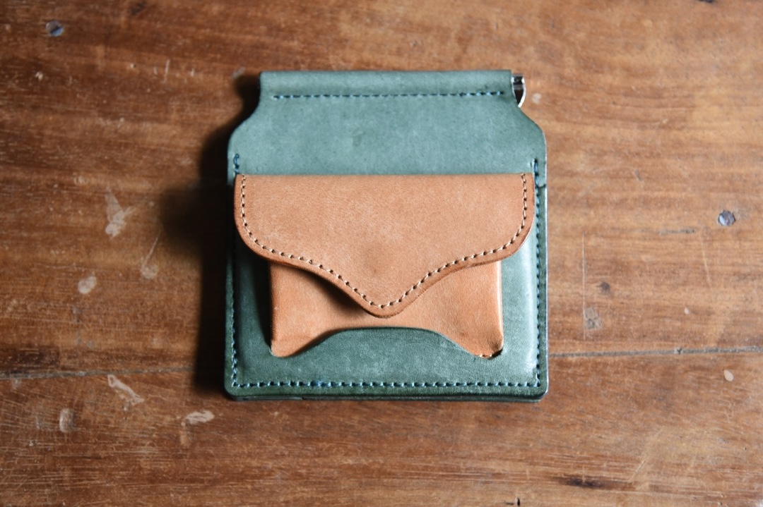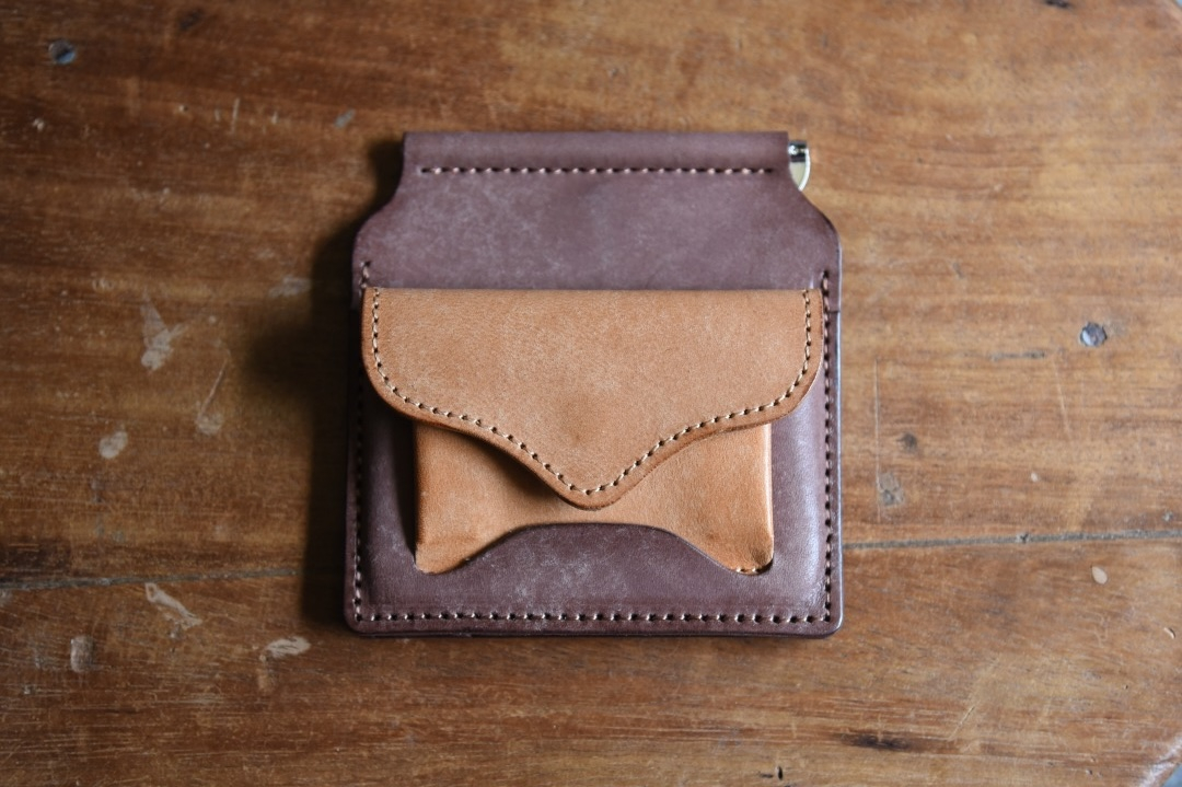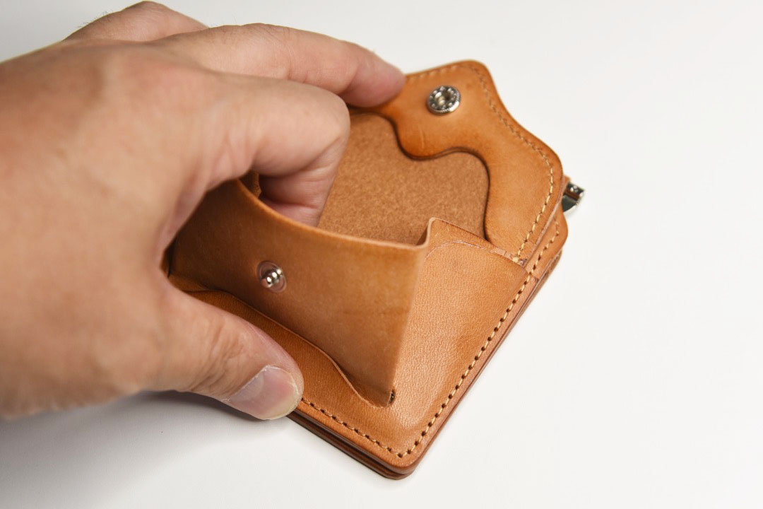 意匠登録出願済みの着脱可能な小銭入れ。金具を使わずに革の重なりによってしっかり固定できます。