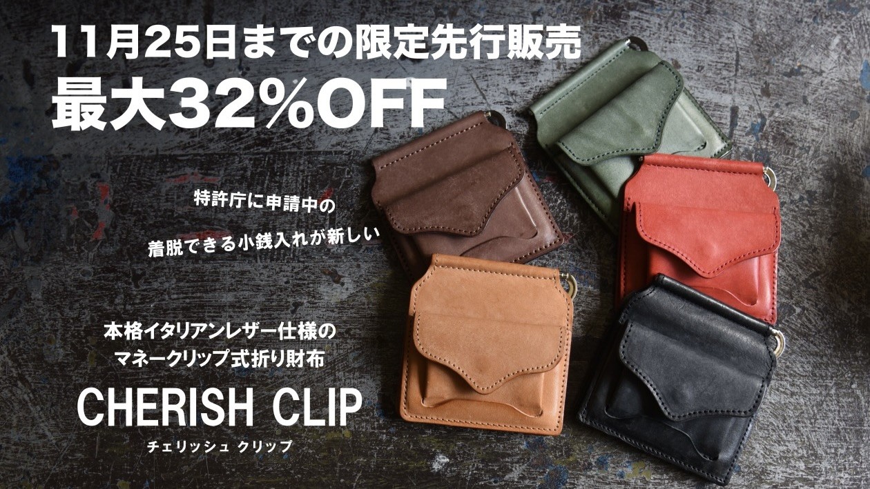 現在応援購入サイト「Makuake」にて限定先行販売中のコンパクトなマネークリップ式本革財布「チェリッシュクリップ」