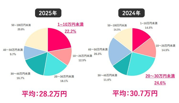 ボーナス支給された人の平均額は28.2万円で、2024年冬の30.7万円から、2.5万円ほど下がる結果となりました。最も多かった金額帯は「1~10万円未満」で22.2%、次いで「50~100万円未満」が20.8%でした。
