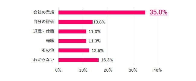 2024年と2025年の冬のボーナスに金額差があったと回答した人に要因を尋ねると、「会社の業績」が35.0%で最も多く、次いで「自分の評価」が13.8%となりました。「退職・休職」「転職」といった環境の変化によって金額が変わった人もいました。