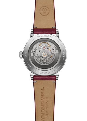 信頼性の高いセリタ社製の自動巻きムーブメントをベースとするCal.RW4200を搭載。シースルーケースバックから、レイモンド ウェイルのイニシャルを象ったW字型ローターの動きを鑑賞することができます。ケースバックの6時位置には、限定モデルを証明する「ONE OF 88」を刻印いたします。