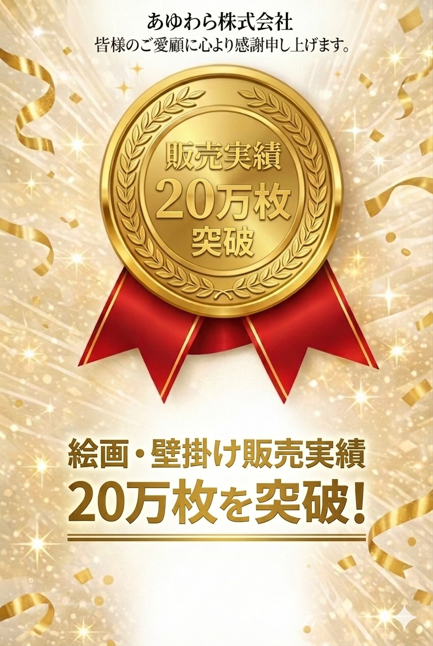 あゆわら株式会社(事業所:埼玉県白岡市、代表取締役:榎本 高行)は、自社運営する絵画・壁掛け販売ECにおいて、累計販売枚数が20万枚を突破したことをお知らせいたします。絵画専門のECサイトとして20万枚の販売実績を公表している企業は、自社調査の限り国内初(※1)となります。