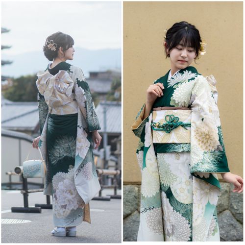 成人式で着る物ほどきらびやかで無く,程よい落ち着いた雰囲気の色柄で、京都の美しい街並みの中に自然と溶け込むデザインとなっています。観光の際にも、周囲の景色と調和しつつ、特別な日の装いとして華やかさを添えることができます。
