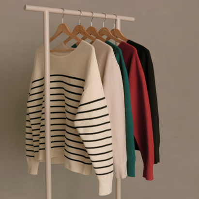 お客様からの様々なご意見、どんなものを求められているかを開発チームと話し合い、生地選びや商品の細かいディテールにまで議論を重ねた結果、今回のこだわりガーターニットが誕生いたしました。