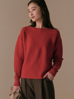 ガーター編みでシンプルなニットは、オフィスカジュアルからデイリーカジュアルまでお使いいただけます。テーパードパンツや落ち感のあるワイドパンツでスッキリきれいめに、デニム合わせでカジュアルに、スカート合わせも相性良く汎用性の高い一枚です。
