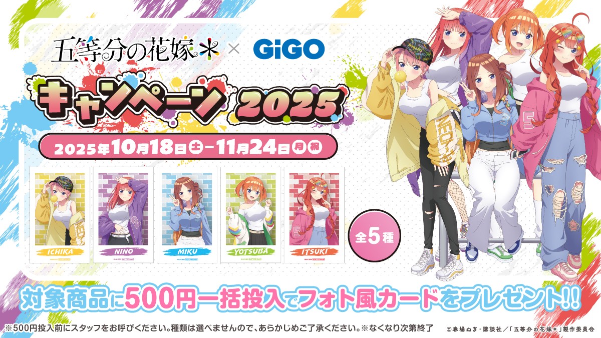 株式会社GENDA GiGO Entertainment(本社:東京都港区 代表取締役社長:二宮 一浩、以下「当社」)は GiGOグループのお店におきまして、TVスペシャルアニメ「五等分の花嫁*」とコラボした、“TVスペシャルアニメ「五等分の花嫁*」×GiGOキャンペーン”を2025年10月18日(土)から開催いたします。