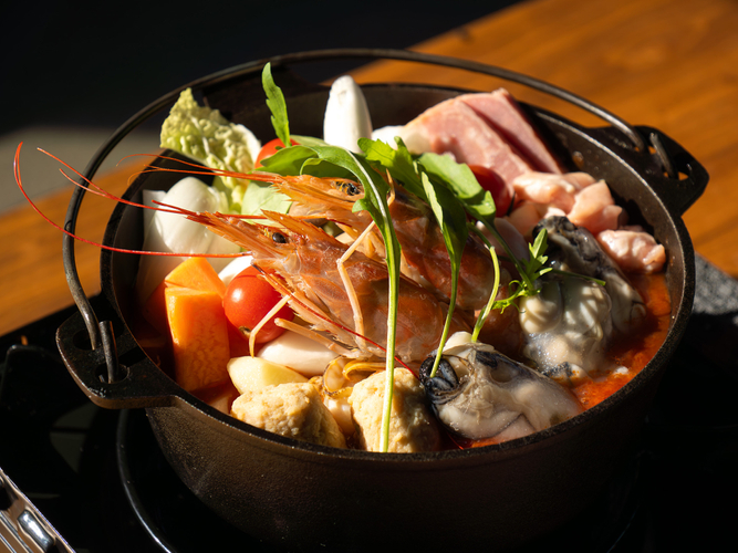 BBQ鍋は月替りで、12月は淡路タマネギ・牡蠣(かき)のオニオングラタン仕立て鍋をご用意します。