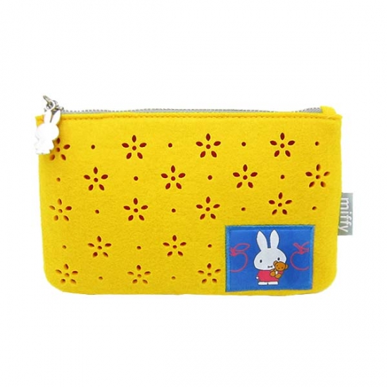 まずはこちら、ビビッドなイエローが新鮮な、ミッフィーのポーチです。素材はフェルトでフラットタイプ。お花模様に切り抜かれたデザインがオシャレです。フラットなので、スッキリと収納できるのも魅力ですね。サイズは縦12cm×横幅20cmです。