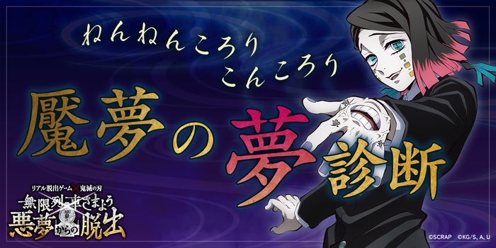 株式会社SCRAPは、『テレビアニメ「鬼滅の刃」無限列車編』とコラボレーションしたリアル脱出ゲーム『無限列車さまよう悪夢からの脱出』の開催を記念して、Webの無料診断コンテンツ「ねんねんころりこんころり 魘夢の夢診断」を公開いたします。