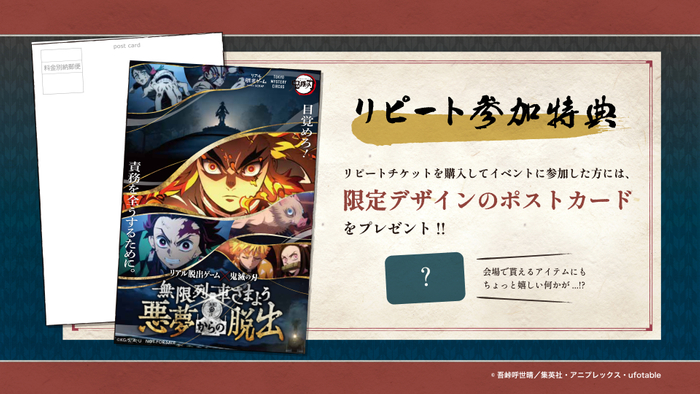 ※「無限列車さまよう悪夢からの脱出」1回目の参加時に会場で手に入るアイテムを、2回目以降参加の際に受付スタッフに見せると「限定デザインポストカード」をお渡しいたします。