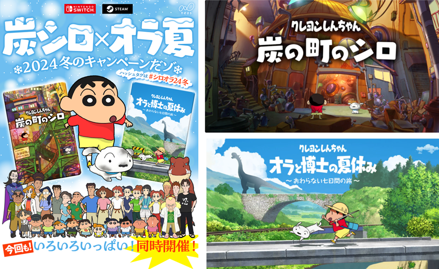 テクミラホールディングスの子会社であるネオス株式会社(本社:東京都千代田区、代表取締役 社長執行役員:池田 昌史)は、Nintendo Switch及びSTEAMにて全世界で販売中の【クレヨンしんちゃん 『炭の町のシロ』】(以下、炭シロ)と、発売から3周年を迎える【クレヨンしんちゃん『オラと博士の夏休み』〜おわらない七日間の旅〜】(以下、オラ夏)において、「オラ夏×炭シロ 2024冬のキャンペーンだゾ!」(以下、本キャンペーン)を開催いたします。