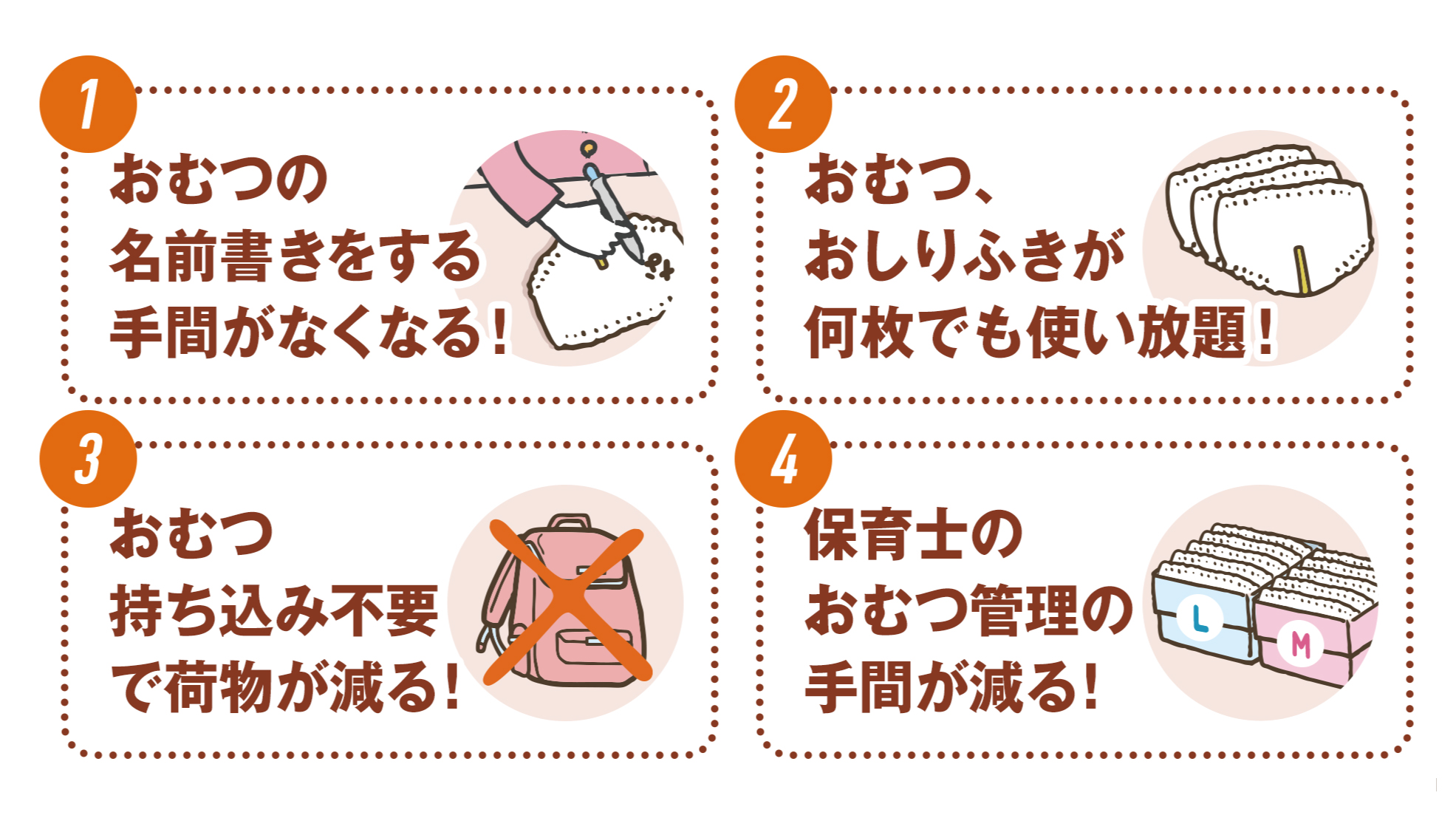 ・おむつを持って行く必要がなくなり、名前を書く必要もなくなって時間にゆとりを作ることができました!