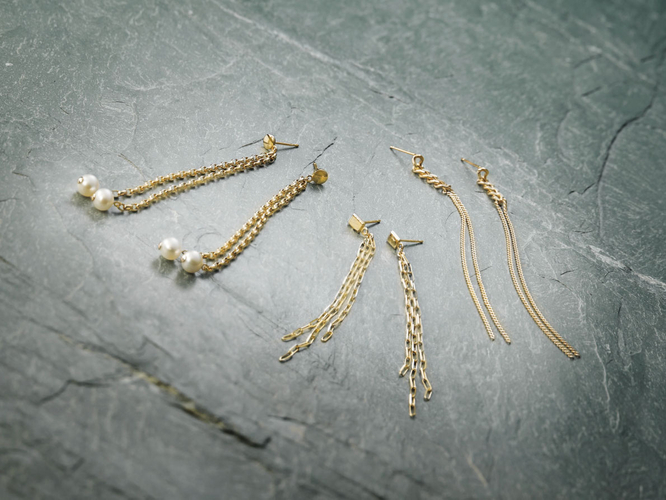 ロングピアスはこれまでよりもさらに長い、7㎝~7.8cmを提案。首をかしげると肩にもたれる長さが新鮮です。