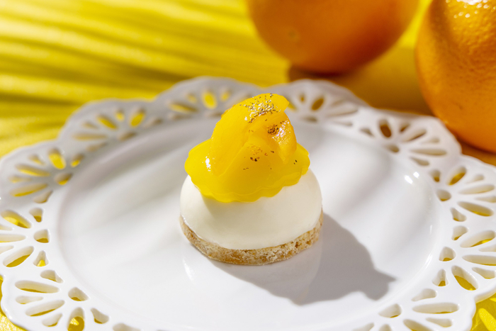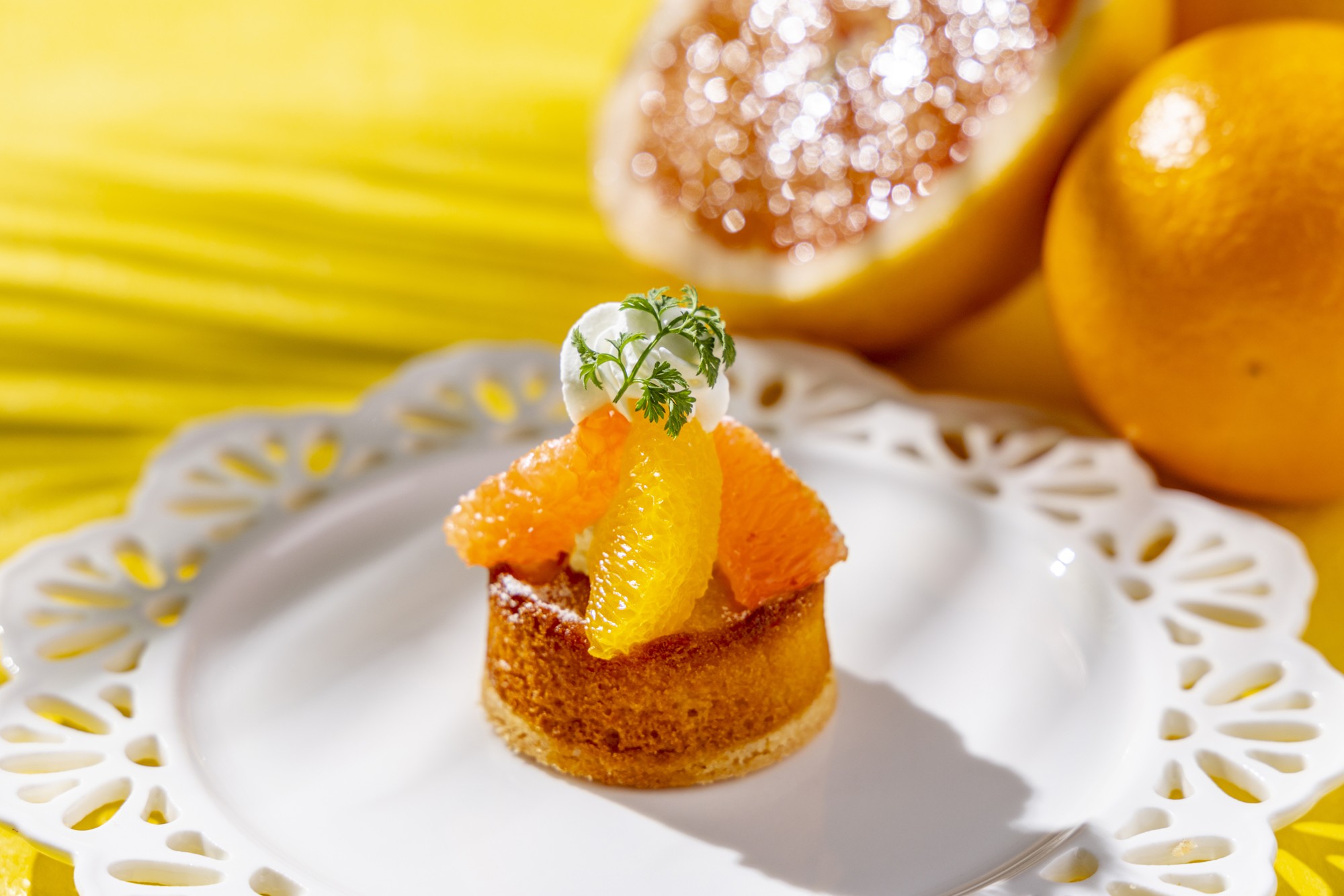 香ばしく焼き上げたアーモンドクリームのタルトにカスタードクリームを絞り、オレンジとルビーグレープフルーツを飾った華やかな一品。柑橘の爽やかな酸味とアーモンドの香ばしさが調和します。