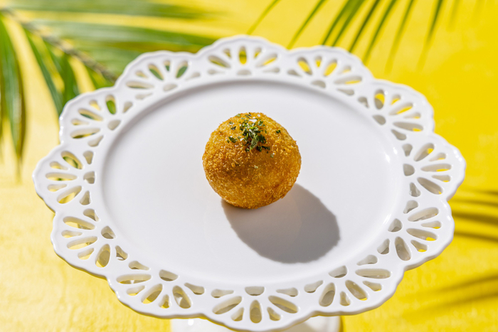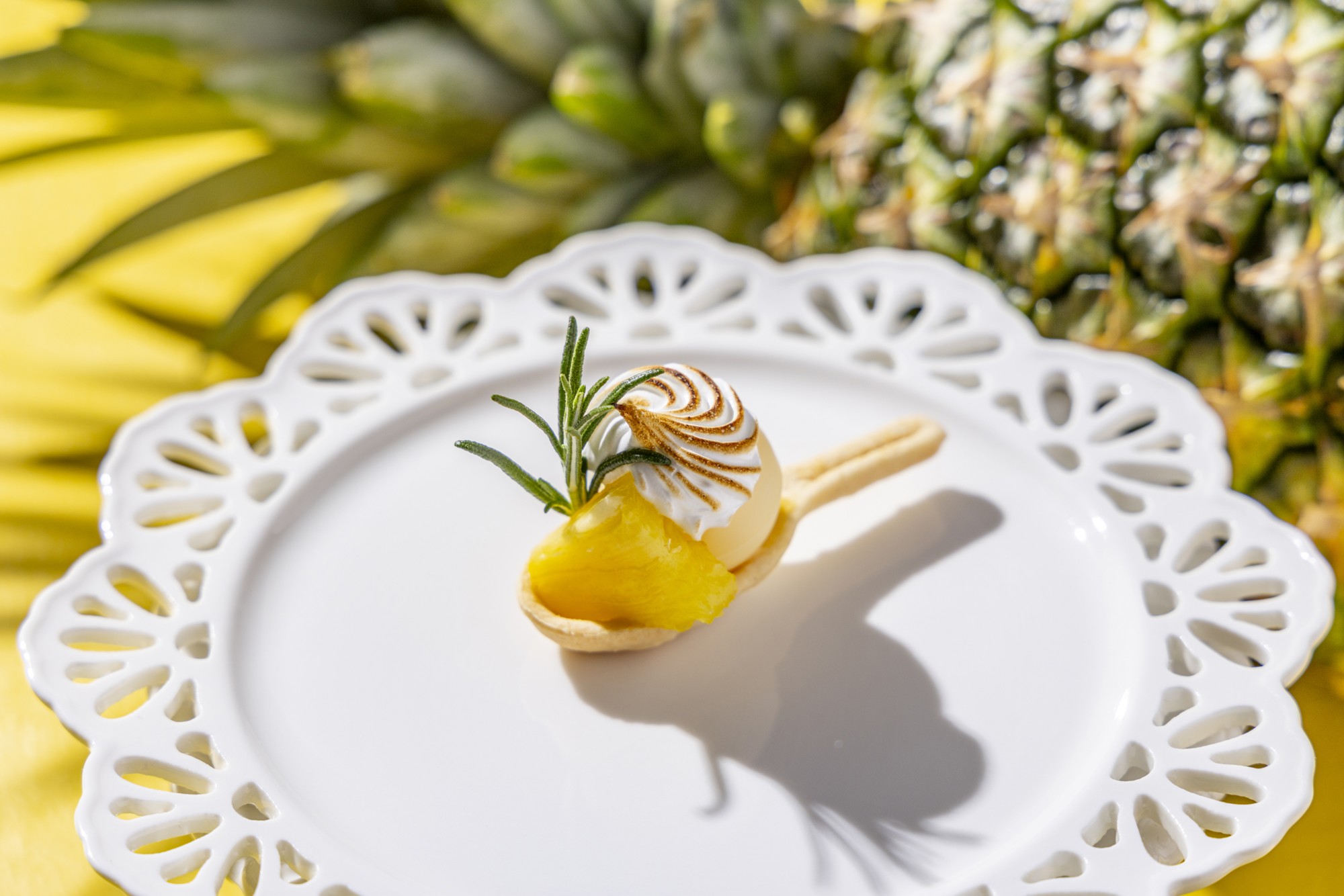 スプーン型のクッキーに、ローズマリーの香りを纏わせたパイナップルのコンポートと、レモンクリームを閉じ込めた球体のチョコレートをのせました。ローズマリーの香りと柑橘の爽やかさが重なります。